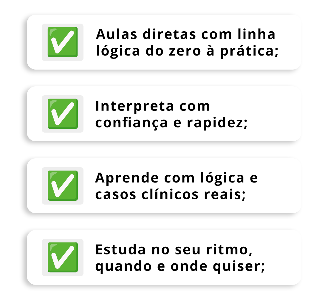 Nada de decorar ondas e fórmulas sem sentido. Você vai entender como nasce cada traçado e por que ele aparece assim. A base fisiológica e a lógica clínica te acompanham desde o início.