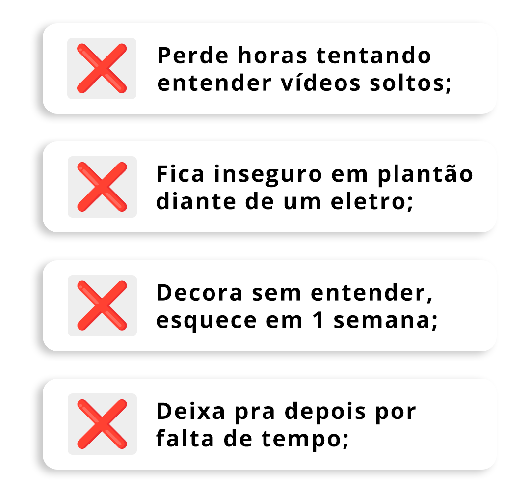 Você vai consolidar o conhecimento com desafios práticos, discussões e sessões ao vivo. Aulas como “Surra de Eletros” e “Fritada de Eletros” te colocam no centro da ação — como se estivesse no plantão.